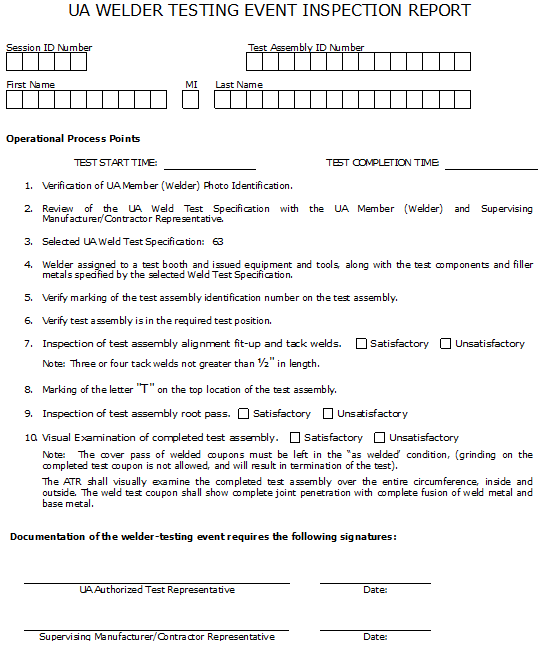 Verify that the welder/brazer has access to a copy of the applicable UA Testing Event Inspection Report. This document covers the in-process inspection hold points, locator stamp, tack welds, start and finish times and requires signatures of both the participating contractor and the ATR.