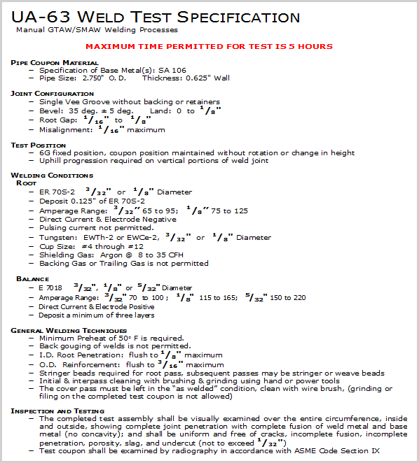 UA Weld Test Specification, under Pipe Coupon Material.