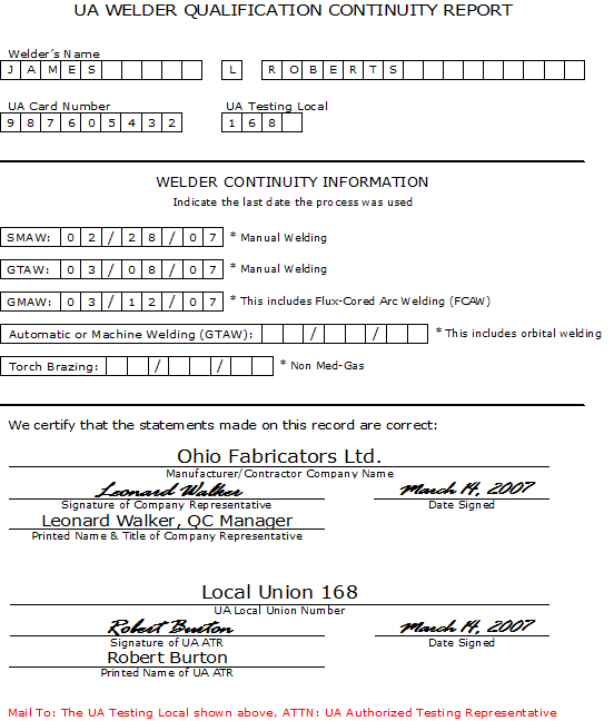 the continuity report lists the Welder’s name, last date each welding process was demonstrated by the individual and is signed and dated by the supervising Representative of the Employing Manufacturer/Contractor.